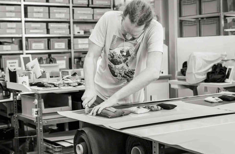 Die Racks entstehen in einer kleinen Manufaktur in Zürich aus nahtlosen, präzisionsgezogenen Stahlrohren. Der Stoff für die Taschen wurde nach seinen Vorgaben in Deutschland aus nachhaltigem Garn entwickelt und wird im Zürcher Oberland von Hand konfektioniert und genäht.